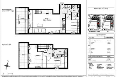 Apartment – duplex of 90 sq.m. of living area, on the top 2 and 3 floors of a new development located in Saint-Laurent-du-Var. It offers a living room of 42 sqm with a terrace of 15 sqm and a kitchen, 3 bedrooms, 2 bathrooms. It overlooks the live square with its shops on one side and the green spaces on the other side.